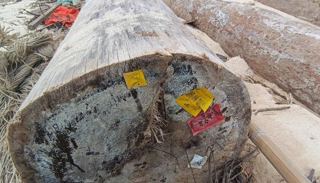 Kayu-kayu gelondongan berlogo PT Minas Pagai Lumber terdampar di pantai Kabupaten Pesisir Barat, Lampung, Minggu (7/12/2025).(dok. Humas Polda Lampung)