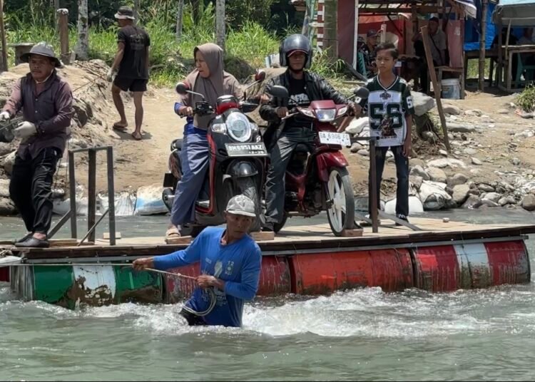 Sebagai solusi sementara, warga menggunakan rakit sederhana berbahan drum untuk menyeberangi sungai. Rakit ini menjadi jalur vital bagi masyarakat dalam menjalankan aktivitas sehari-hari, mulai dari bekerja, bersekolah, hingga mengangkut hasil pertanian.