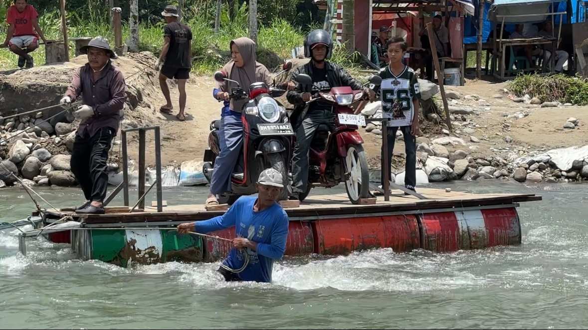 Sebagai solusi sementara, warga menggunakan rakit sederhana berbahan drum untuk menyeberangi sungai. Rakit ini menjadi jalur vital bagi masyarakat dalam menjalankan aktivitas sehari-hari, mulai dari bekerja, bersekolah, hingga mengangkut hasil pertanian.