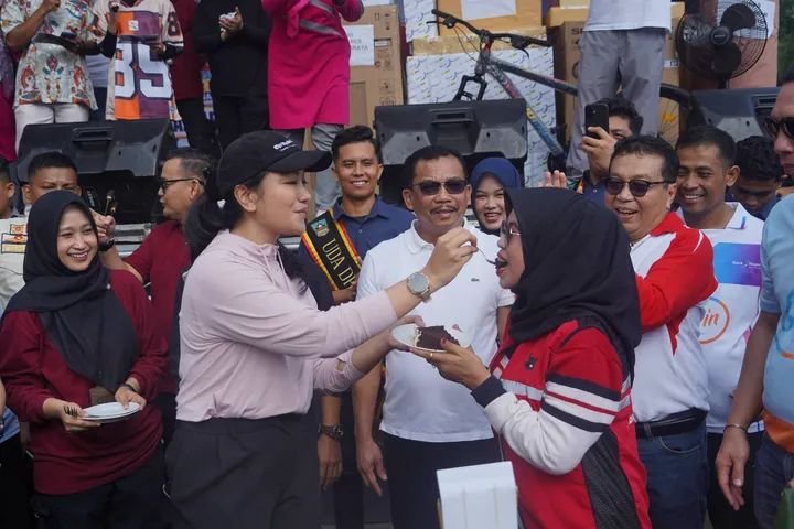 Bupati Dharmasraya, Annisa Suci Ramadhani, mendapatkan kejutan perayaan ulang tahun dari peserta Dharmasraya Car Free Day di kawasan kantor bupati setempat pada Minggu (19/4/2026) pagi. Foto: Pemkab Dharmasraya