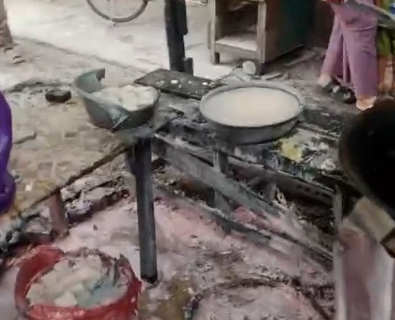 Api yang diduga berasal dari kebocoran gas menghanguskan gerobak Tahu Sumedang milik Desi Imelda (41).