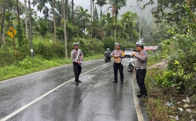 Polisi melakukan olah tempat kejadian perkara di tempat kecelakaan di dekat objek wisata Air Tigo Raso di Jorong Muko-Muko, Nagari Koto Malintang, Kecamatan Tanjung Raya, Agam, Rabu (19/11) pagi. Foto: Polres Agam