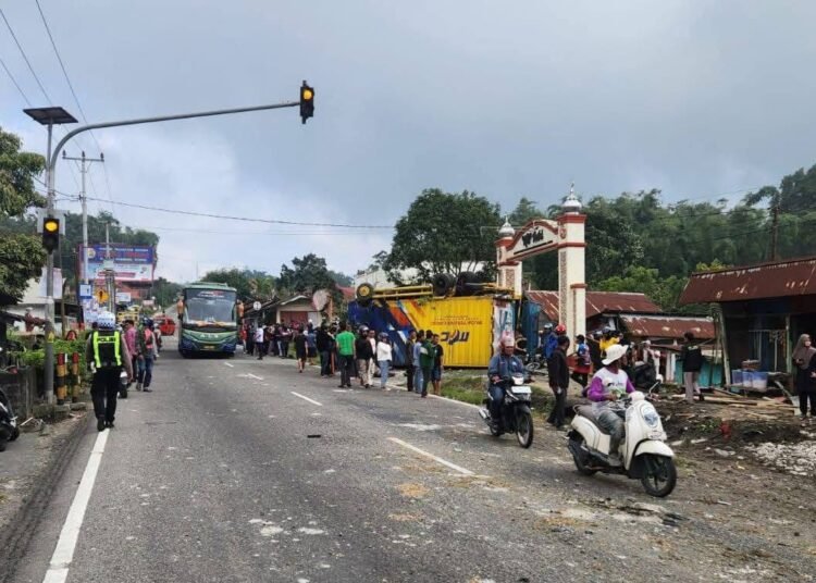 Dua warga yang sedang duduk di warung tersebut tidak sempat menyelamatkan diri dan meninggal dunia setelah tertabrak truk trailer. Kendaraan besar itu kemudian terbalik di halaman rumah warga dengan kondisi rusak parah.