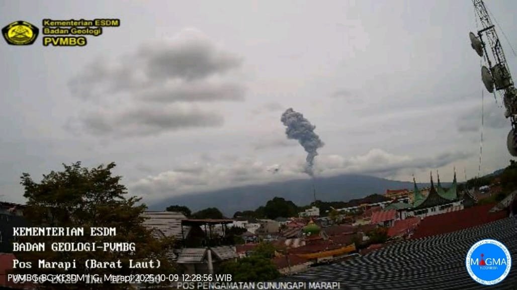 Kabarminang – Gunung Marapi yang terletak di Kabupaten Agam dan Tanah kembali erupsi pada Kamis, (9/10) siang. Tinggi kolom abu pada erupsi kali tercatat kurang lebih 1.500 meter.