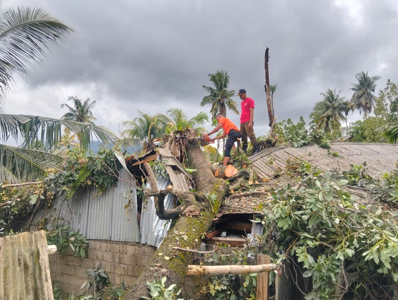 Sebuah pohon tumbang menimpa rumah warga di Ulu Gadut, Kelurahan Limau Manis Selatan, Kecamatan Pauh, Padang, pada Sabtu (5/4/2026) sekitar pukul 15.20 WIB. Foto: BPBD Padang