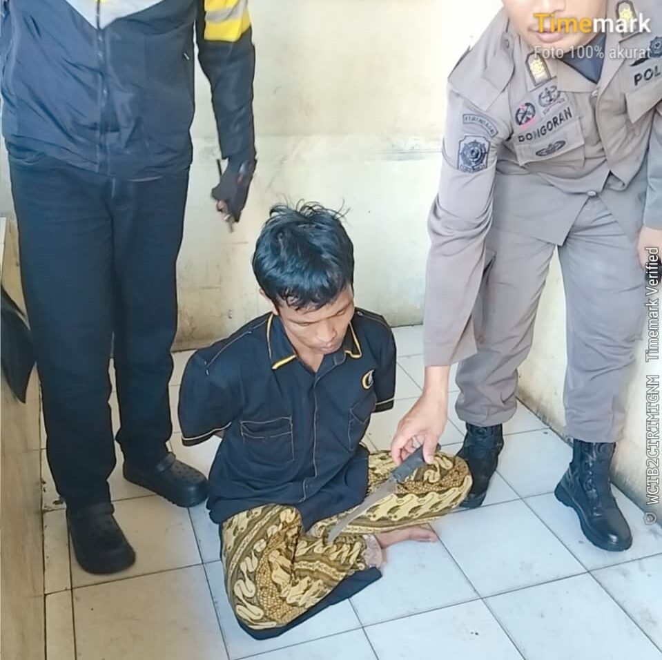 Petugas perempuan yang berada di lokasi kemudian meminta bantuan personel laki-laki. Setelah tiba, petugas langsung mengamankan Karim beserta senjata tajam yang dibawanya.
