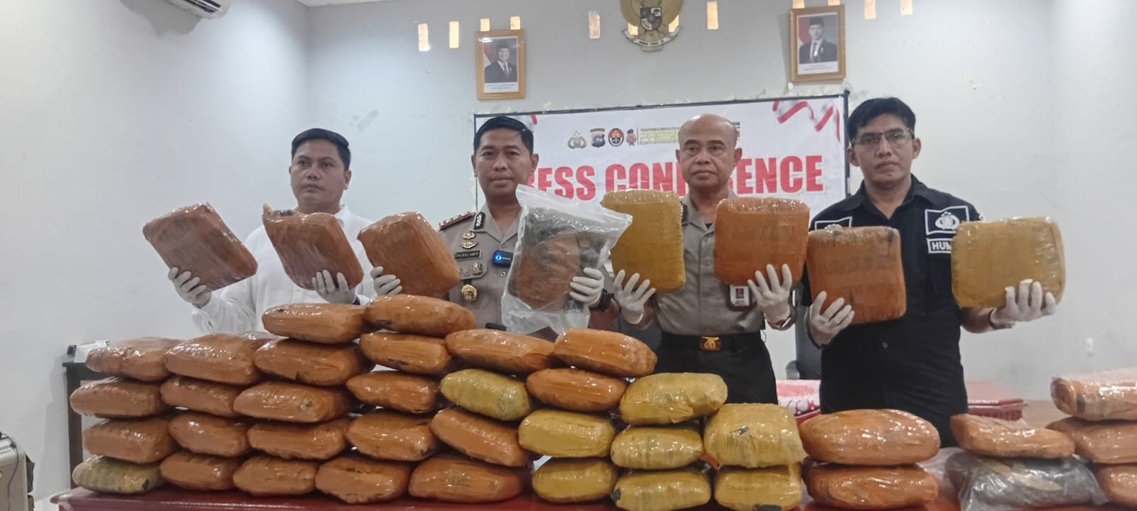 Dari lokasi tersebut, polisi menyita tiga karung besar berisi ganja, masing-masing berisi 14 paket, 12 paket, dan 20 paket besar, serta sejumlah plastik pembungkus dan satu unit timbangan kiloan. Saat penggerebekan, rumah kontrakan itu dalam keadaan kosong dan diduga hanya digunakan sebagai tempat transit.