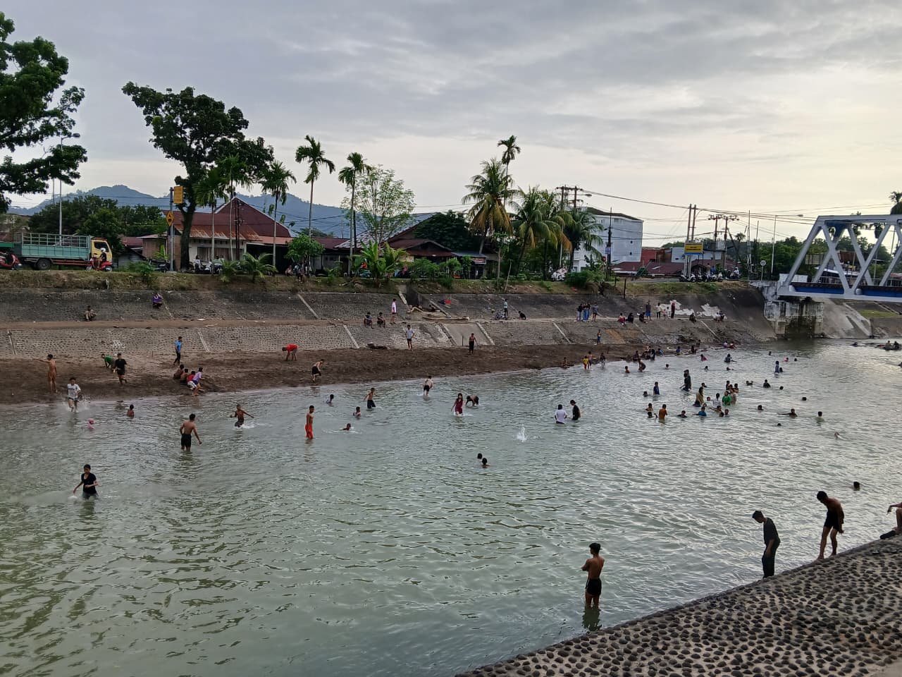 Pantauan Sumbarkita pada Minggu (4/1/2026) sore terlihat aliran Banda Kali dimanfaatkan untuk bermain dan bermandi-mandi, mulai dari anak-anak, remaja, hingga dewasa.