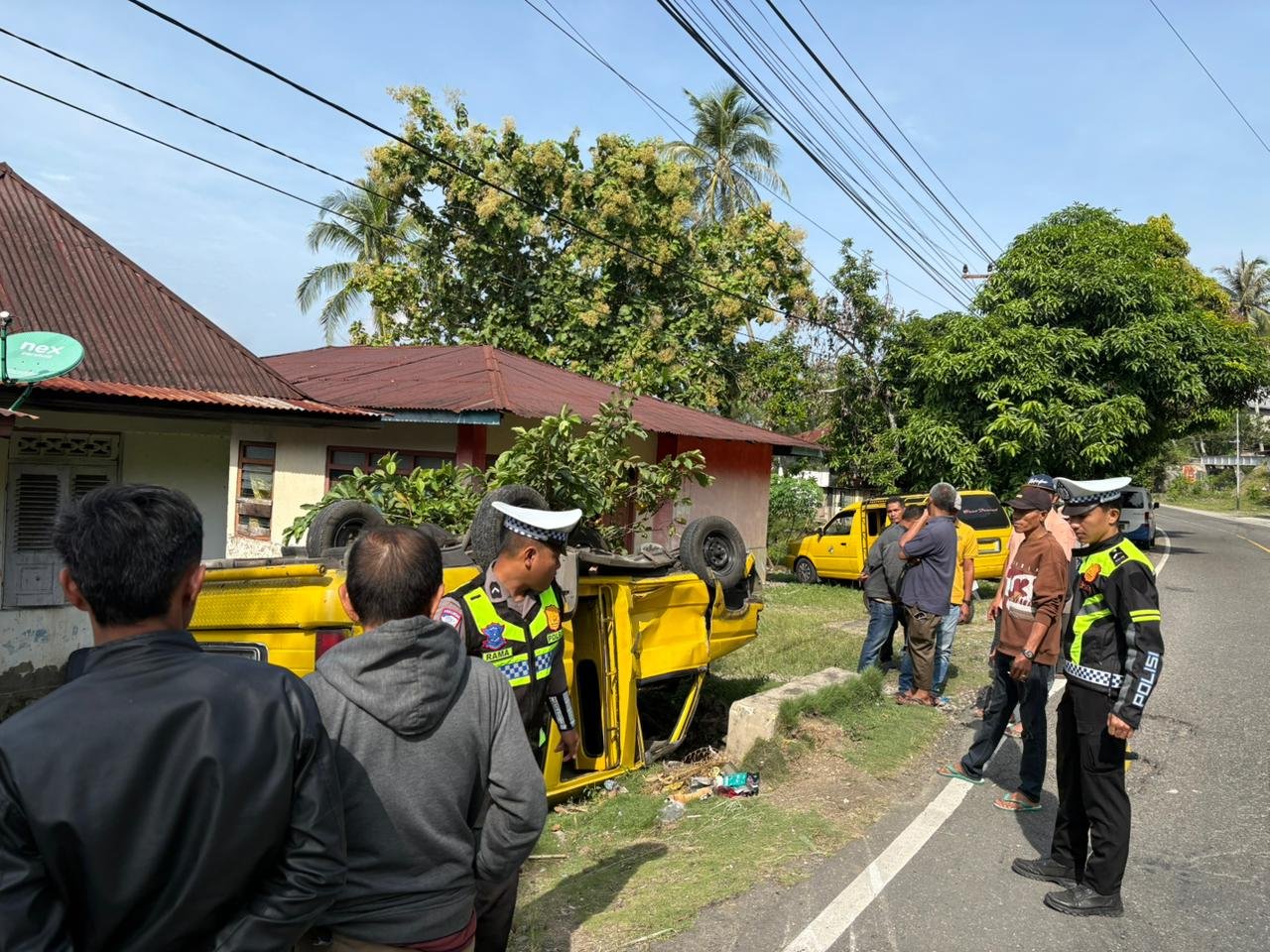 Akibat kondisi tersebut, mobil angkutan umum itu terbalik ke sisi kiri jalan.