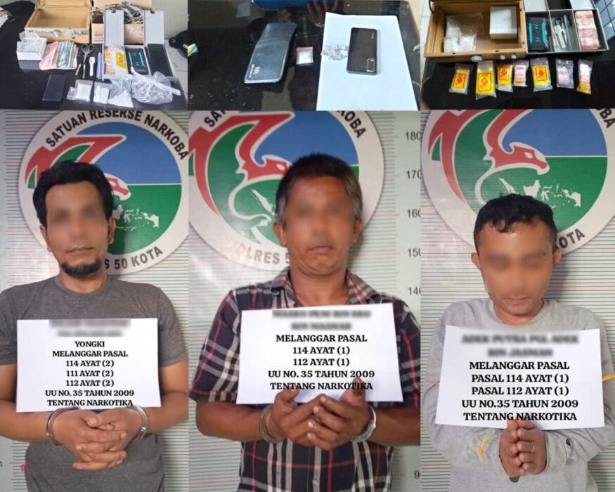 Kabarminang – Polisi menangkap dua pria pengedar dan satu pemakai narkotika berinisial RV (42), MP (43), dan AP (32), di Kabupaten Limapuluh Kota, pada Selasa (11/11/2025) dini hari.