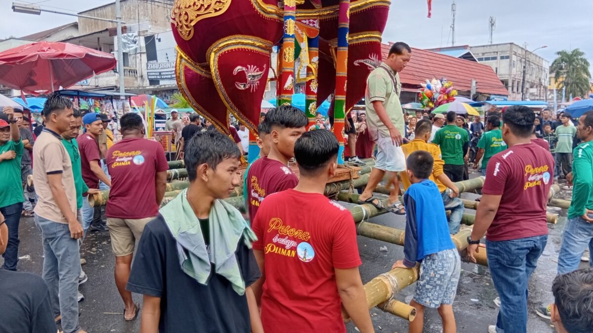 Kabarminang.com – Puluhan pria dewasa bahu-membahu mengangkat dua Tabuik raksasa seberat setengah ton dalam puncak Festival Tabuik Piaman 2025, Minggu (6/7). Tabuik yang menjulang hingga 12 meter itu diarak dari pusat kota menuju Pantai Gandoriah, disaksikan ribuan pengunjung yang memadati kawasan sejak pagi.