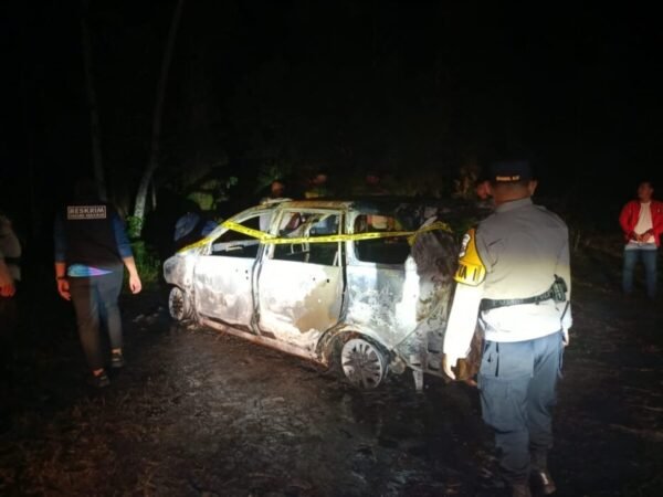 Warga Korong Kampuang Paneh, Nagari Aia Tajun, Kecamatan Lubuk Alung, Padang Pariaman, membakar sebuah mobil terduga pencuri kambing pada Kamis (22/1/2026) malam. Foto: Polsek Lubuk Alung