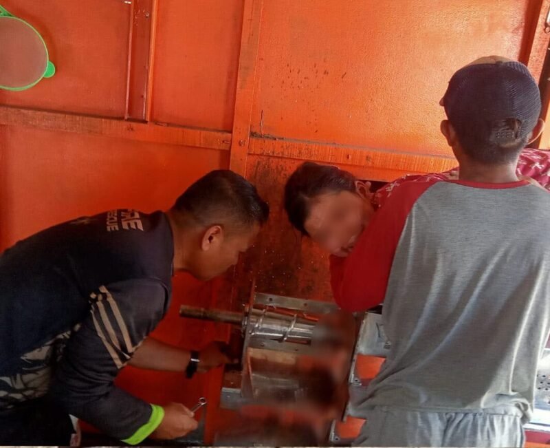 Petugas Damkar Kabupaten Solok mengeluarkan tangan kanan remaja yang tergiling mesin peras kelapa pada Minggu (18/1/2026). Foto: Damkar Kabupaten Solok