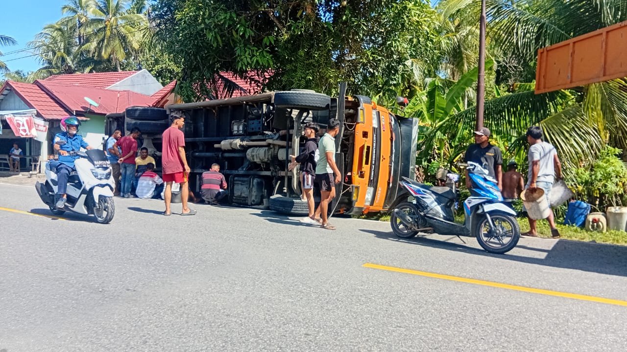 Erni menyebutkan, setelah kejadian tersebut, warga sekitar langsung membantu dengan memindahkan muatan cangkang dari truk yang terguling ke truk lain agar tidak menghambat arus lalu lintas.