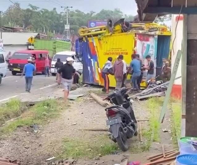 Sementara itu, truk trailer bermuatan pupuk terus melaju tanpa kendali dan kembali menabrak dua pejalan kaki, masing-masing Jefrizal (37) dan Alfizar (51), yang berada di sebuah warung di sisi kiri jalan. Truk tersebut juga menghantam warung milik warga sebelum akhirnya terbalik di pekarangan rumah warga.