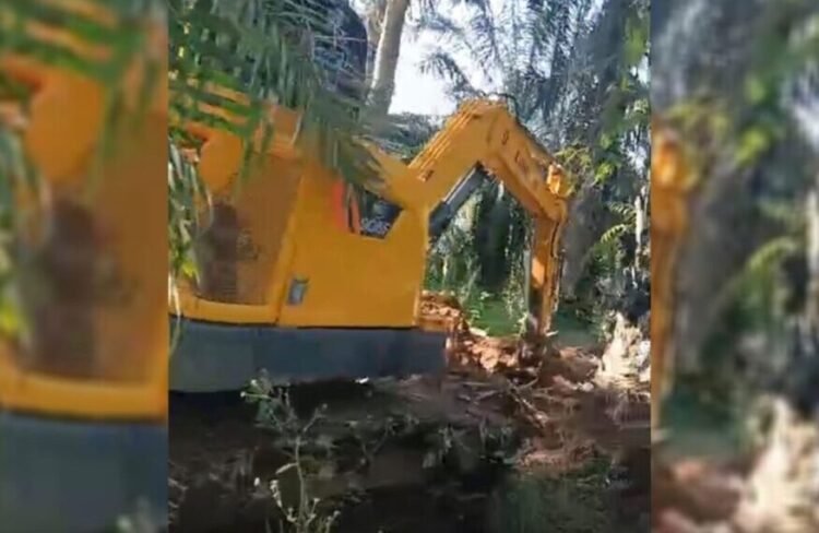 Pekerja Yarsi Sumbar menggali parit dengan ekskavator di sekeliling tanah yang diklaim sebagai milik yayasan itu di Jorong Batang Biyu, Nagari Lingkuang Aua Timur, Kecamatan Kinali, Pasaman Barat, beberapa waktu yang lalu. Foto: IST