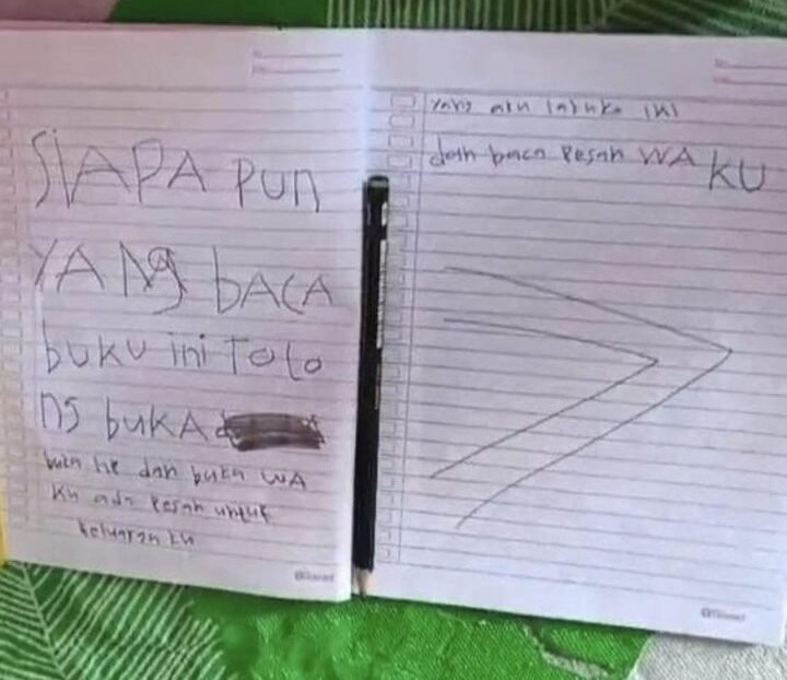 Isi pesan itu berbunyi, “Siapapun yang baca buku ini tolong buka HP dan WA ku. Ada pesan untuk keluargaku yang aku lakukan ini dan baca pesan WA ku.”