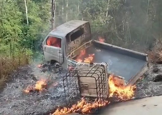 Mobil boks berwarna kuning itu diketahui terbakar setelah sebelumnya mengalami kecelakaan tunggal saat melintasi jalan menanjak. Dugaan sementara, kecelakaan tersebut menjadi pemicu munculnya api yang kemudian membesar dan menghanguskan kendaraan.