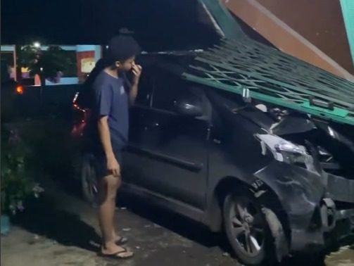 Bagian depan kendaraan tampak remuk akibat benturan keras. Warga sekitar tampak berdatangan ke lokasi sesaat setelah kejadian untuk memberikan pertolongan.