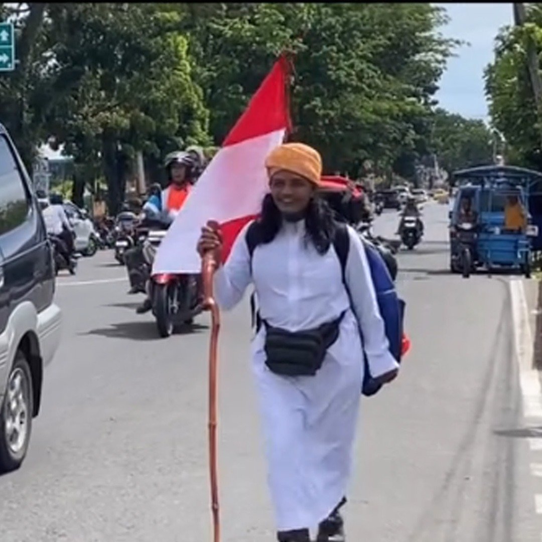 Video itu juga memperlihatkan Alif mengenakan pakaian berwarna putih, menyandang sebuah tas, serta membawa bendera putih selama memulai perjalanan.