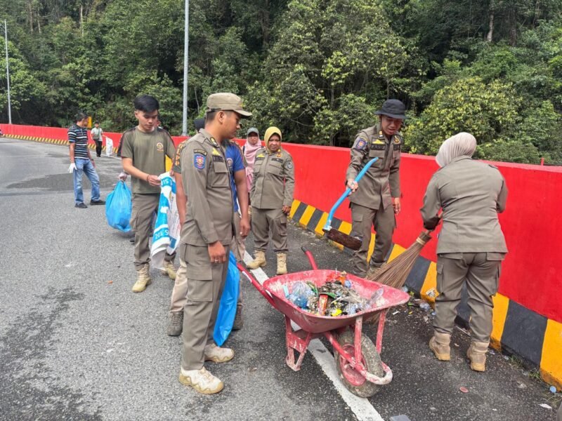 Selain menyoroti warung, Satpol PP bersama organisasi perangkat daerah (OPD) juga bergotong royong untuk membersihkan sampah di sepanjang Fly Over Kelok 9 pada Selasa (31/3/2026). Kegiatan tersebut dimulai sejak pagi hari.
