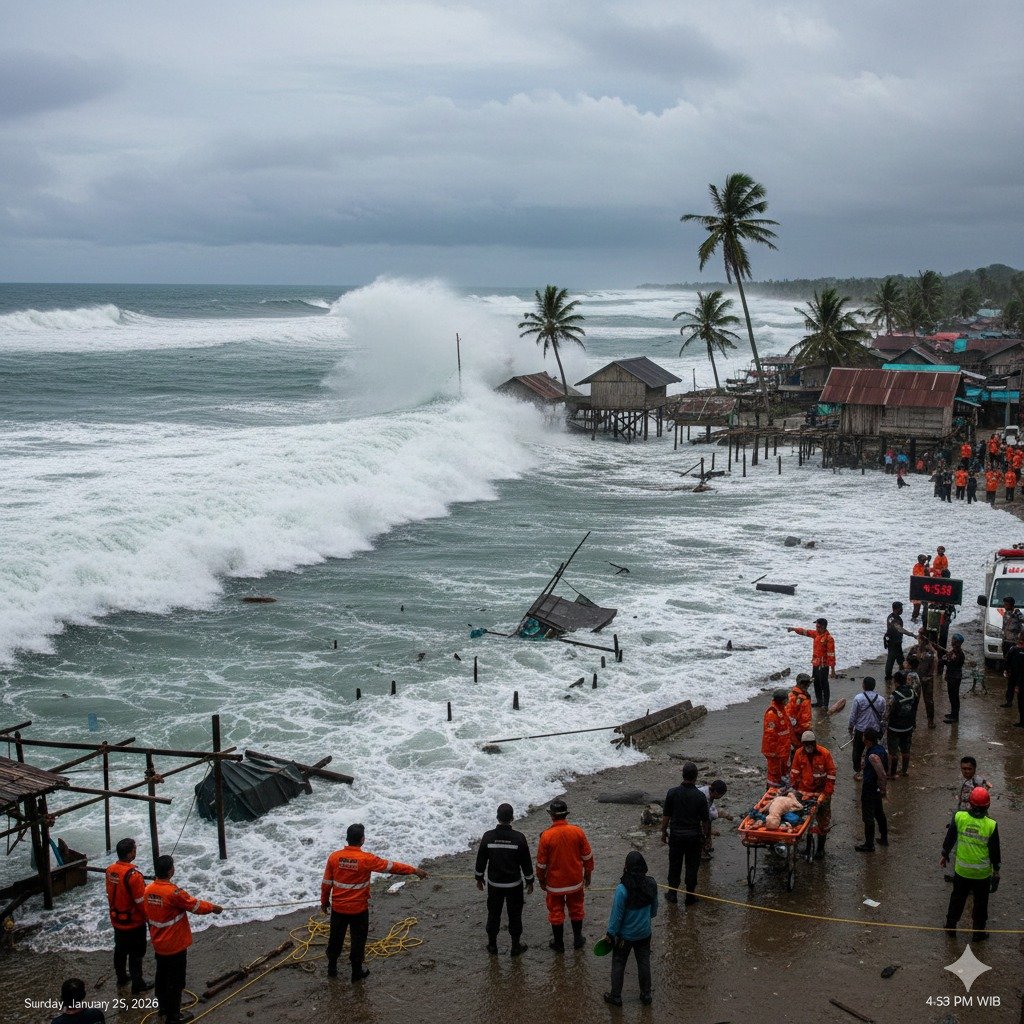 Badan Meteorologi, Klimatologi, dan Geofisika (BMKG) Maritim Teluk Bayur mengeluarkan peringatan potensi gelombang tinggi hingga 4 meter di perairan Sumatera Barat pada 29–30 Januari 2026.  Foto: AI